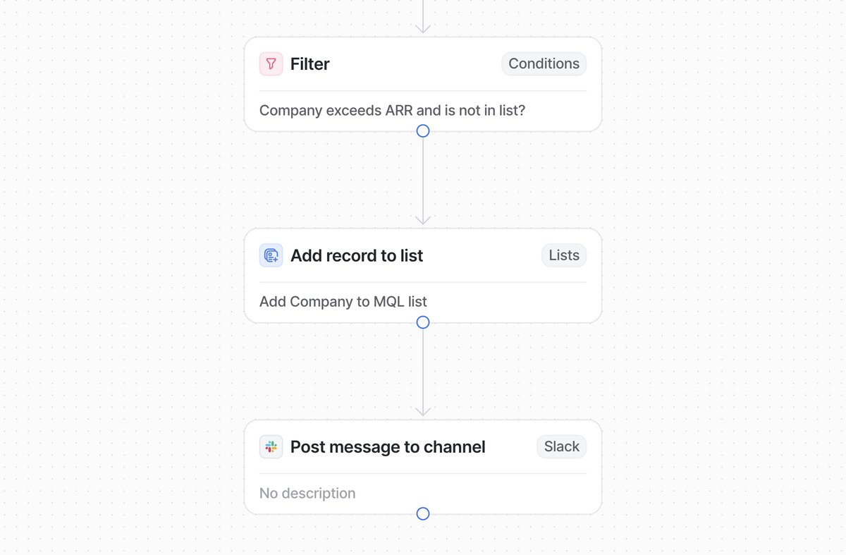 - Score crosses MQL threshold (e.g., 50 points). Update the Lead Status select attribute to "MQL." Send a Slack notification to the sales channel. Create a task for the assigned owner with a deadline of 24 hours.