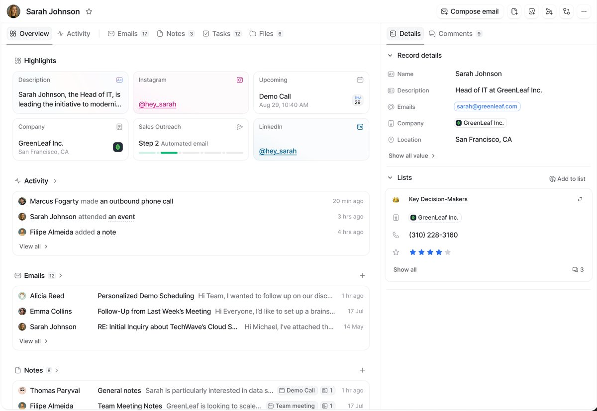 An Attio record page showing auto-enriched company data, activity history, and list memberships.