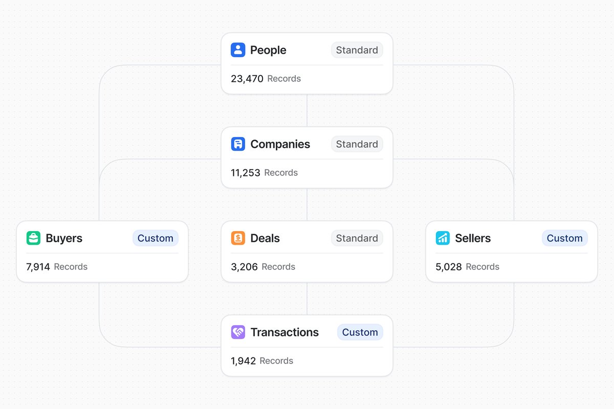 Custom objects like Buyers, Sellers, and Transactions extend Attio's standard data model for complex use cases.
