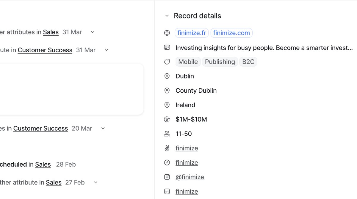 Relationship intelligence is where expectations need adjusting. Affinity's email and calendar sync builds a relationship strength score and interaction history that won't transfer. The good news is Attio has its own enriched attributes. It'll pull in company data, domains, social profiles, and more automatically once records exist. But Affinity's proprietary relationship scoring doesn't have a direct equivalent. If your team relies heavily on "who knows who" data, plan for that gap.